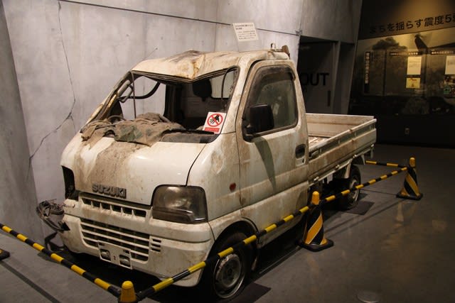 地殻変動によって捻じ曲げられた線路が展示されています(見づらいですがガラス張りの床の下にあります)。