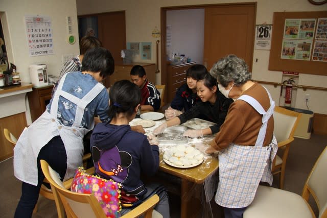 ▽高齢者ふれあい体験(グループホームどんぐりの里、通所介護どんぐりデイサービス)…この日は餅つき行事だったため、利用者の方と一緒にお餅丸め