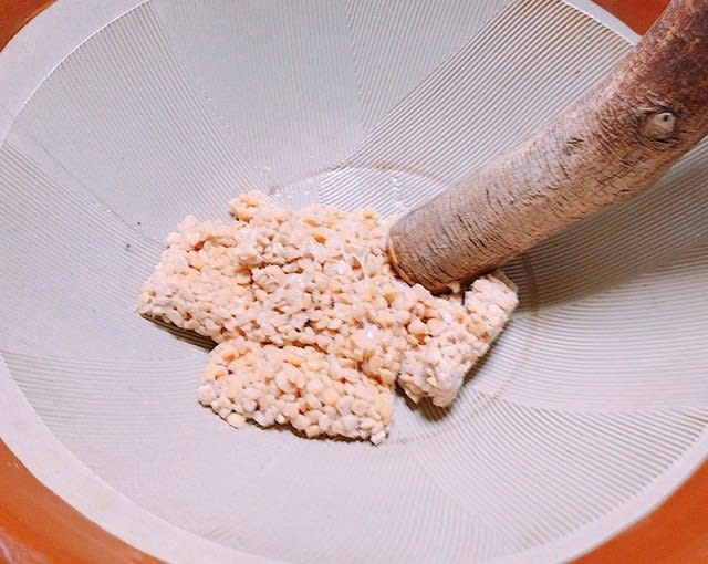 ▽約1時間の格闘の末、ほぼペースト状になった納豆たち