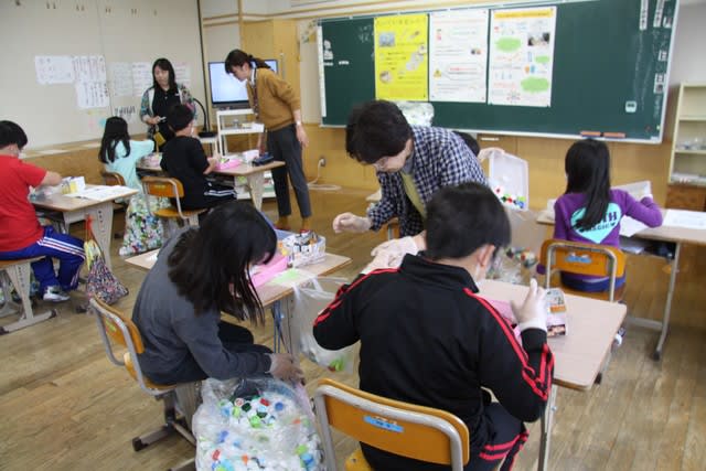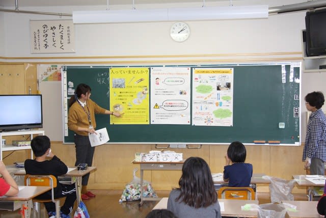 「町民の皆さんのご協力で収集されたリングプルやペットボトルキャップがお金に変わり、それが車椅子やワクチンへと変えられ、町内で役立てられたり、開発途上国の子どもたちの命を救うことにつながっている」ことを伝えると、児童の皆さんからは時折「え~~」と驚きの声が上がりました。