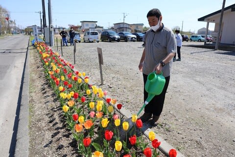 お話を伺ったところ、地元の朝霧町内会から毎年鹿対策が大変で続けるのが難しくなった街路花壇のチューリップを引き取ってお世話することになったのだそう。