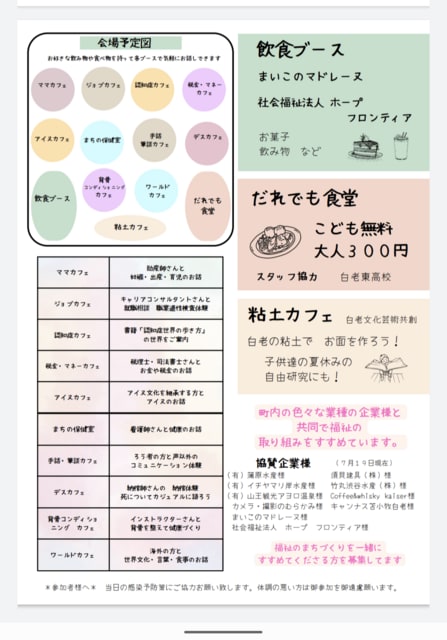内容:カフェのようにお茶をしながら、福祉活動を体験できるコーナーを楽しめます。