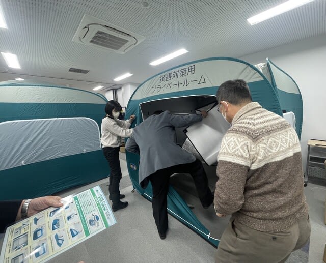 実際に段ボールベッドと防災テントを組み立てました。